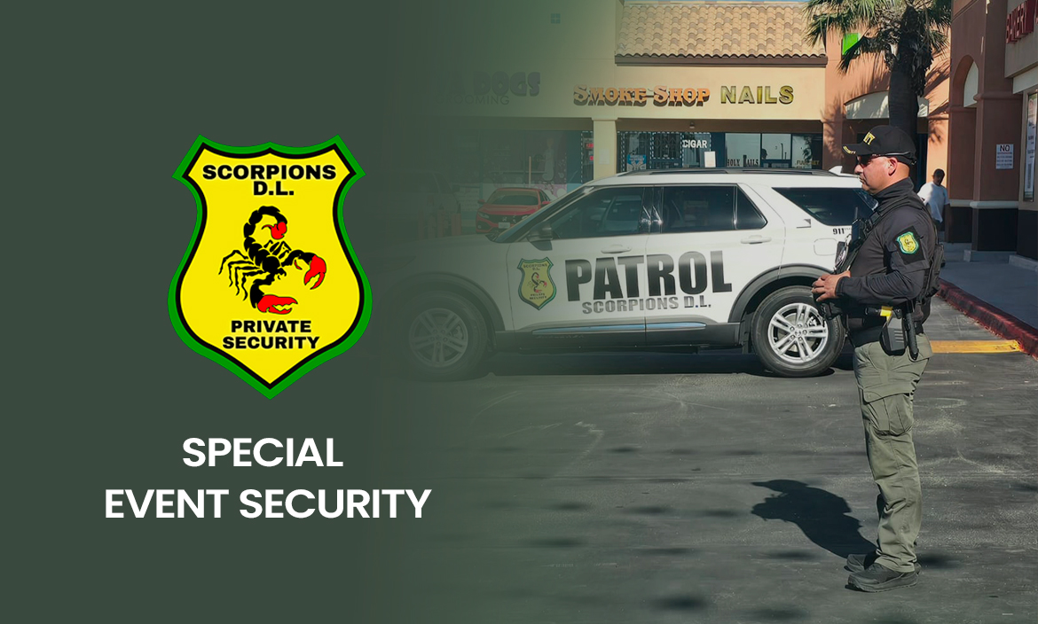 HOME ABOUT US ABOUT US OUR MISSION OUR VISION OUR SERVICES Patrol Services Commercial Security Industrial Security Loss Prevention Agents Armed and Unarmed Guards Residential Security Special Event Security CONTACTS Special Event Security From corporate events to private gatherings, our security professionals ensure smooth operations.We manage access control, crowd management, and emergency response during events Special Event Security